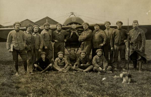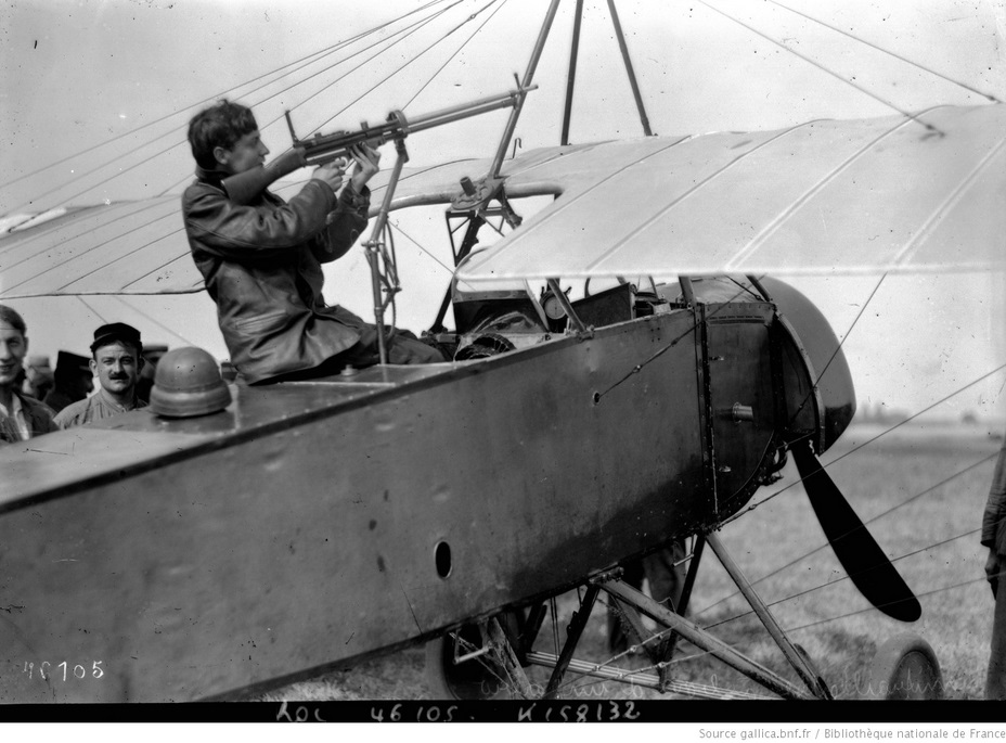 En 1915, Rolland Garros et Jules Vedrines mettent au point le tir axial à travers l'hélice à Villacoublay sur un Maurane Saulnier.